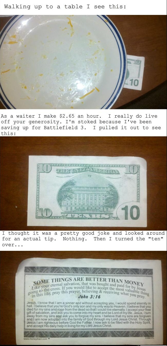 If it was accompanied by a real tip, it would just be another annoying Chick-tract/proselytizing tool and would go in the garbage with the rest without any hard feelings.