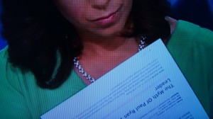 Conservative media sources are calling CNN’s Soledad O’Brien biased and unobjective (Soledad O’Brien? Biased? Nawwwww!) because a CNN cameraman inadvertently caught her cribbing from the leftward blog “Talking Points Memo” for ammunition as she questioned Virginia House of Delegates Republican member Barbara Comstock regarding new-GOP Veep nominee Paul Ryan’s budget proposals. The blog post she was reading from was called “The Myth of Paul Ryan The Bipartisan Leader.” At one point, O’Brien claimed to be reading a release from Senator Wyden’s (D-OR) office, but she was actually reading an excerpt from the blog that included a quote from Wyden. Newsbusters, the conservative counterpart to the Left’s Media Matters, regards this is a real gotcha!, concrete proof of the unethical coordination between the mainstream media, progressive attack blogs, and the Democratic party.