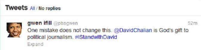 If you think Chalian’s sentiment was an aberration, you haven’t been paying attention. Sure enough, one of Obama’s most shameless shills in the media, PBS’s Gwen Ifill, immediately tweeted her support: