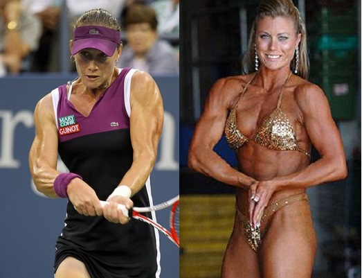 naturally low lipid percentage women….my wife is 50 kilo and has triceps and a back like a small man….but i dont think she would reach massive proportions if worked anerobically.serena williams looked very much the boy in her young years…..i’m surprised no one has taken advantage of the renee richards affair….no….i’m sure some have and the association is hand cuffed to respond……besides if big hitting men are making tennis billions,who is going to say anything……..but it is biologically morally wrong.