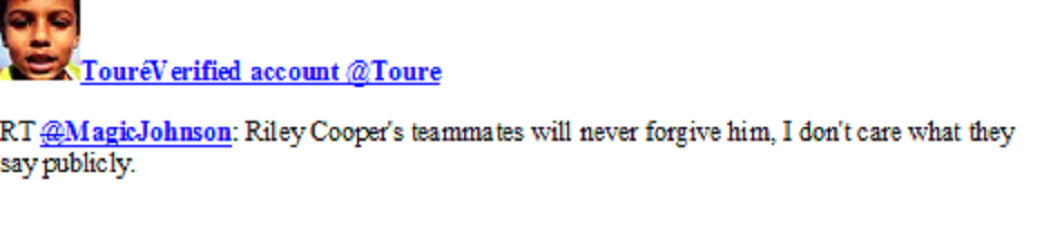 “Riley Cooper’s teammates will never forgive him, I don’t care what they say publicly. Riley should be given a second chance. People will never look at Riley Cooper the same. “