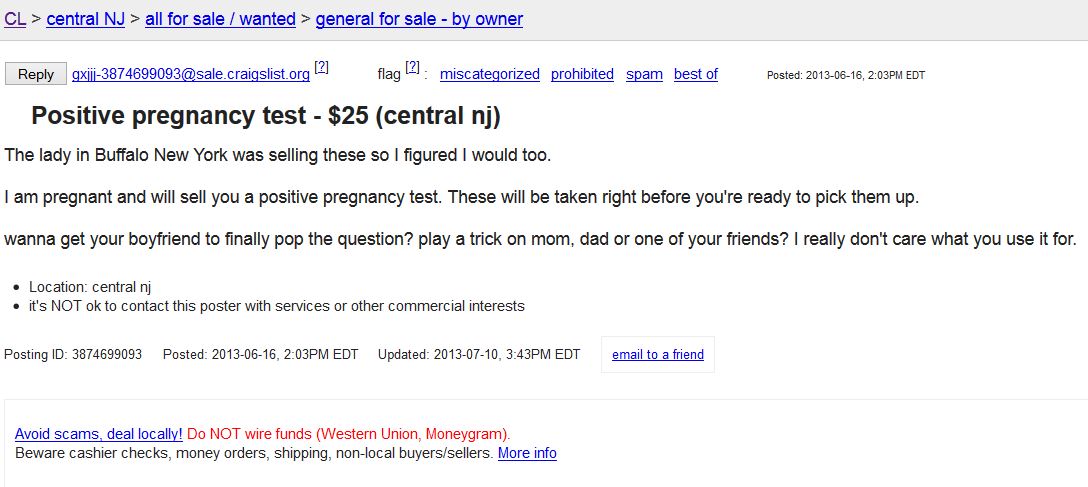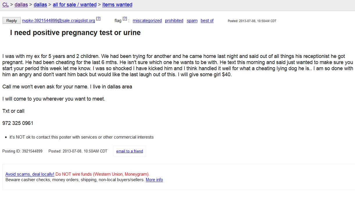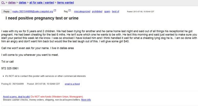 Even more alarming is this trend, flagged by the website The Daily Dot: women are selling their positive pregnancy test results on Craig’s List, for women who want to trick their boyfriends into marrying them by showing them a positive strip. And there are customers ready to buy. From the Daily Dot: