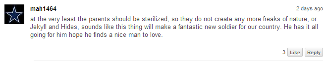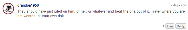 Now the transgender student, known in the media as “Jane Doe,” is being insulted, threatened and harassed, and has shown suicidal tendencies. She is undergoing treatment for emotional distress. No wonder. One section of the national media, based on nothing but innuendo, has accused her of being not only a harasser, but a crazy harasser, which is what any transgender teen who used her privilege of using the Ladies Room to make offensive comments to other students would be. The story never made any sense, unlike this one, on a similar theme. Never mind, though: given their cue, plenty of readers were ready to advocate violence against an innocent student. Here is a sample of the worst of the comments on the Fox News story (there are many more):