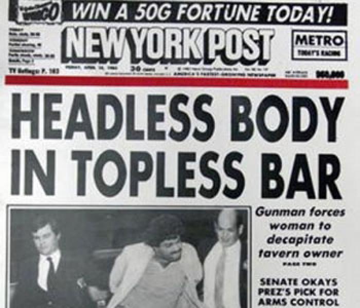 The complaint at issue, echoed in many places but most trenchantly phrased in Salon, is that the New York Post has a tasteless front page. Well, lick me all over so I gleam like a trout!* How is this even newsworthy?