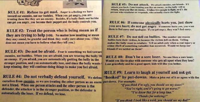 • I know it’s been a bit since you posted your comment, but I have only seen it, and this article recently. Please don’t judge Israel Kalman or his Bullies to Buddies program based on the flier the Nebraska school sent out. That flyer reads like a parody of the actual program. This flier looks like someone read his seversal articles and the free manuals on the site (manuals are only accessible if you sign up for his free newsletter). Then they tried to cobble together bits and pirces from several, in random order, and tried to paraphrase most of it. I’m not sure about in 2014, but I do know that now the free manual “How to Stop Being Teased and Bullied Without Really Trying” May be copyrighted, but can be shared verbatim with a couple minor caveats.