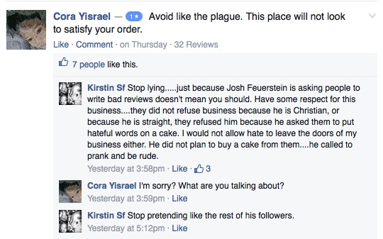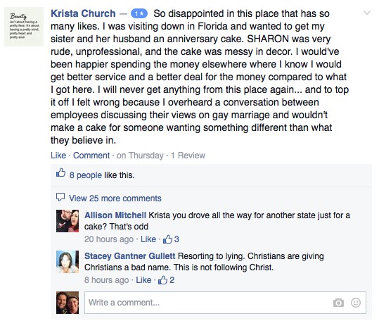 He posted a video launching the attack, disclosed the owner’s name, and encouraged the good Christians of shriveled souls and negligible IQ scores to “call her yourself, ask her the same exact questions,” “show the hypocrisy,” and generally harass the store out of existence. They made a good pass at it, too, flooding the business’ Facebook page with insults, posting multiple one-star reviews, and making up bad experiences they said they had doing business with the store. Here are a couple of examples:
