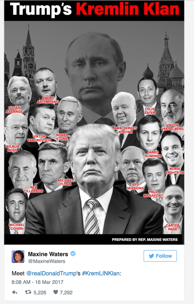 Nice. Also completely unfair, evidence-free, and irresponsible for anyone in her position.  Such a tweet on similar evidence (none) would justify a libel suit if the target was a private citizen. Would it be less “racist” to attack Water’s  integrity, professionalism and intellectual acumen than to make fun of her wig? No, it would be exactly as racist, as in “not racist at all.” It would be, however a lot more professional and fair.
