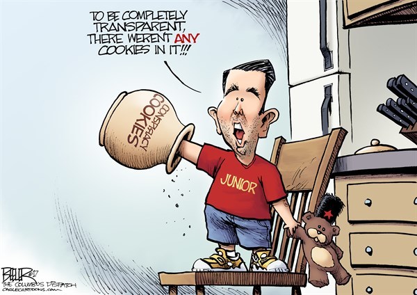 2. I notice both Trump and Donald Jr. have the Nixon beard. Could it be that the cartoonist is trying to imply something? The one with Donald Jr.’s hand in the cookie jar is pretty funny though. Unfortunately, presidents in the past have been portrayed as morons (Ford), sanctimonious fools (Carter), mousie little wimps (Obama), and greedy bastards (FDR). I really don’t think this is going to stop.