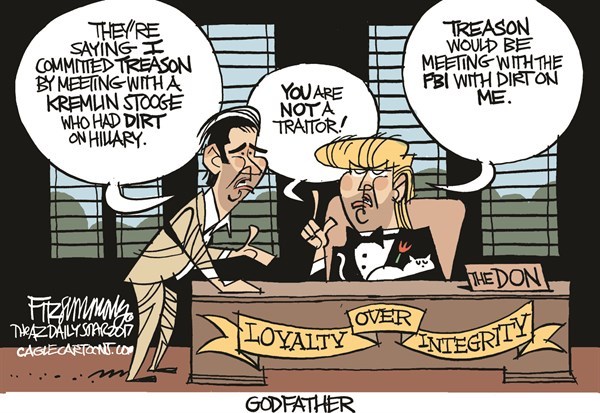 Here (and above) is a sample of the bumper crop of political cartoons inspired by the Donald Trump, Jr. aborted meeting to acquire damaging information on Hillary that never materialized.