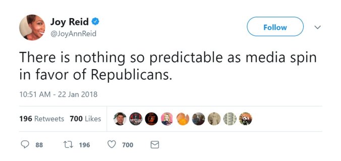 A pundit, commentator, or journalist who would express such a counter-factual opinion should be disqualified for employment in journalism or punditry. Either Reid is lying in order to spin for Democrats ( and should be fired) or her perception is so warped that it is irresponsible to allow Reid a platform to mislead the public (and she should be fired.) There is no third choice. By continuing to employ someone who says or believes that the media is pro-GOP, MSNBC demonstrates contempt for the truth as well as its audience.