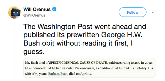 2. George H.W. Bush death ethics. a) Incompetence. Here is the Washington Post’s first obit after the former President’s demise yesterday: