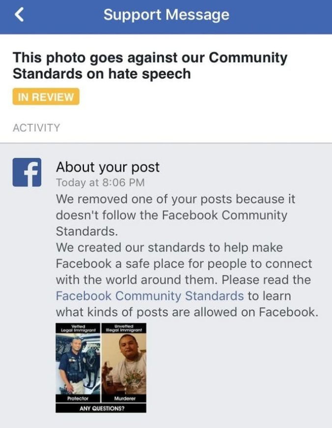 When a user posted a picture with Singh and Arriaga side-by-side with the contrasting (and accurate) labels “vetted legal immigrant” and “protector” and “unvetted illegal immigrant” and “[alleged] murderer”by the appropriate photos, Facebook removed the image: