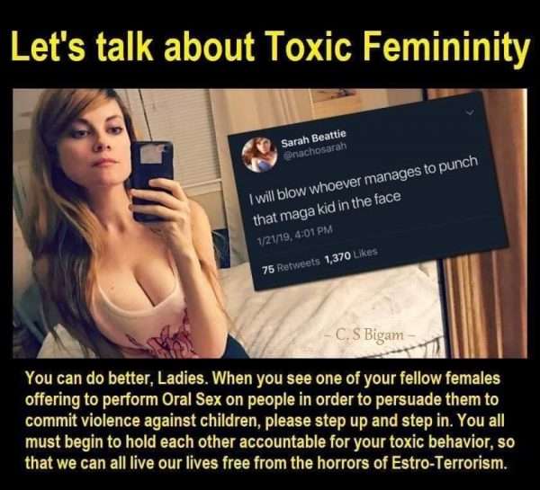 “Toxic masculinity”! God, what a sick, nauseating society we have the misfortune of living through.Shit like this is a byproduct of the age of technology, and what can be expected to happen when all needs are met, every itch scratched, and all natural, healthy stressors removed. Wasn’t it Ben Franklin who said that people who have no troubles will invent them? Well, here ya go: toxic masculinity!
