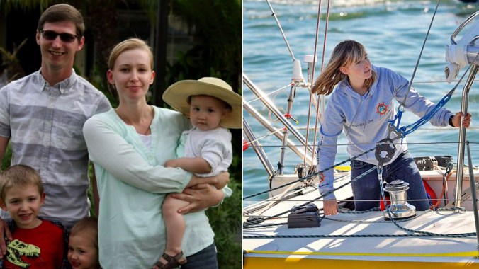 - Eric and Charlotte Kaufman, who brought their 1-year-old daughter Lyra and her 3-year-old sister, Cora along with them as they embarked in March on the great adventure of sailing across the Pacific as the first leg of a planned circumnavigation of the globe. “In a 36-foot sailboat. Alone. With a toddler. And an infant. Morons.”