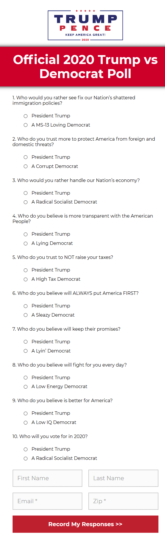 So this is not unethical like a push-poll. It’s not really intended to deceive anyone with an IQ above room temperature. It’s just a simple campaign ad dressed up like a poll, but with very little discernible intent to deceive.