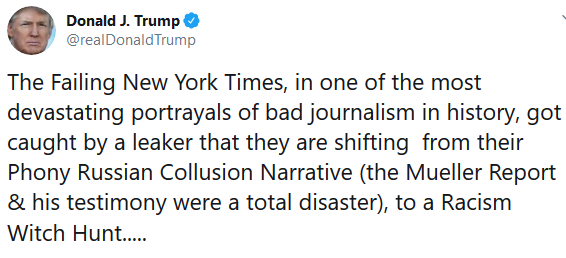 The New York Times Reveals That It Will Move On From Its Three-Year “Trump Stole The Presidency By Colluding With Russia” Strategy For Undermining Him To A “Trump And Republicans Are Racists” Strategy For Defeating Him In 2020
