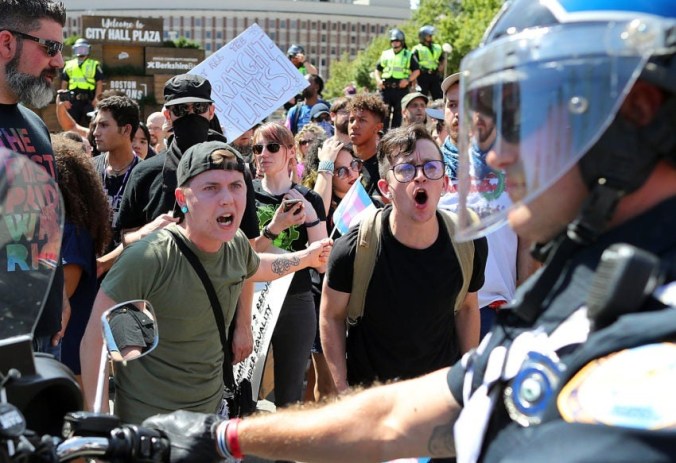 The parade attracted a few hundred participants, and  even more counter-protesters —this was Boston, after all— and a heavy (and expensive) police presence. The counter-protesters taunted marchers and chanted “Alt right, get off our streets, no justice, no peace.”  Well, at least it wasn’t “Hey, hey, LBJ, how many LGBTQ people did you marginalize today?,”  but at then that taunt wouldn’t deny a Constitutional right.