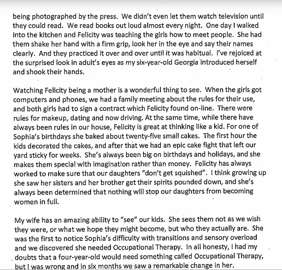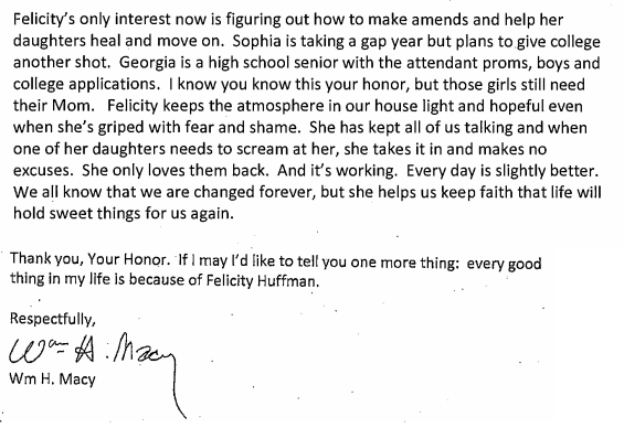 I though the first part of the letter, describing Felicity as a mother, was okay. It’s clearly puffery meant to put her in the best possible light, but I have hard time believing her husband would write something like without meaning it. So I find it relevant from a character witness standpoint. I think he should’ve stopped there, though. The part about the effect on the kids is irrelevant. Whatever they went through is their mother’s fault, not the law’s. When he described their daughter begging them to “do something” after she was turned down by her college of choice, my knee-jerk reaction was amusement rather pity. Thing is girl, it was your parents “doing something” that started this mess.