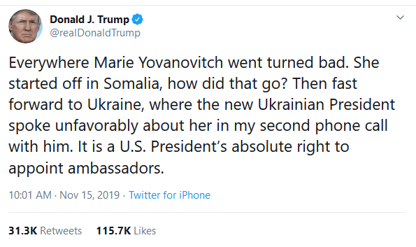 4. Return to Plan H! Plan H on the list is “Tweeting stupid stuff is impeachable.” While the bitter ex-ambassador was whining under oath, President Trump couldn’t restrain himself from tweeting,