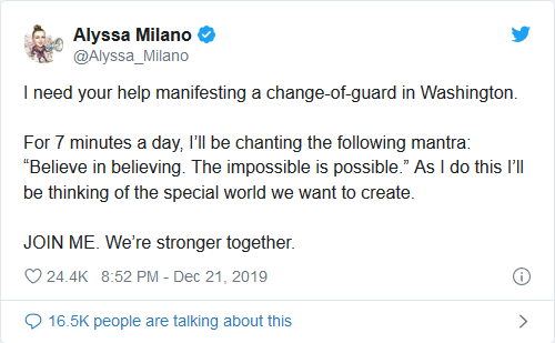B. Former “Whose the Boss?” star Alyssa Milano, apparently determined to prove beyond all doubt that being an actress conveys no authority regarding politics beyond that of the average out-patient at a methadone clinic, snapped entirely. Earlier in the week she had appeared at an anti-Trump rally featuring her and Naked Ex-Congresswoman Katie Hill, who told the crowd, “Impreah the motherfucker!” (for he has degraded the civility of political discourse!) Yesterday she sent this tweet…
