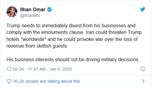 It’s marvelously idiotic tweet. House member though she is, Omar doesn’t know what the emoluments clause means: the archaic Constitutional provision addresses foreign bribes, not potential conflicts of interest arising out of foreign threats. Moreover, if the President put his business interests over national interests, that would lead him to avoid taking action which might risk his business interests.