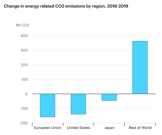 “The United States saw the largest decline in energy-related CO2 emissions in 2019 on a country basis – a fall of 140 Mt, or 2.9%, to 4.8 Gt. US emissions are now down almost 1 Gt from their peak in the year 2000, the largest absolute decline by any country over that period. A 15% reduction in the use of coal for power generation underpinned the decline in overall US emissions in 2019.”