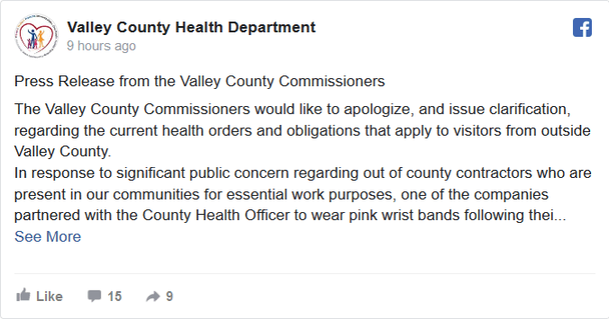 …their14- day quarantine. This was implemented to help alleviate community concerns about the potential spread of COVID-19. These bands are not government issued and are not a part of any of the current health orders in place. Rather, they are a good faith effort by these contractors to try to put the community at ease. In a break-down of our internal processes, a flier went out to local business owners seemingly indicating such wrist bands are required for out of county individuals, and that local business owners were obligated to report violations of the health orders. That is not the intent of Valley County, and that flier has been rescinded.