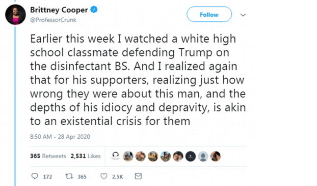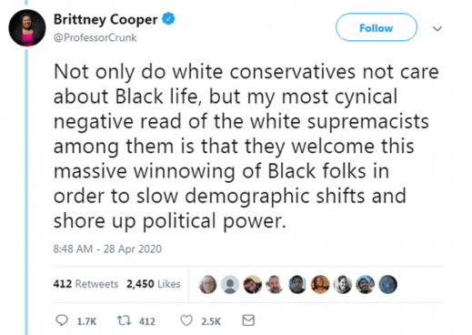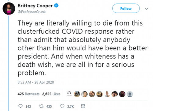 She’s right: they won’t fire her. An equivalent flood of race-based bile by a white male professor about President Barack Obama and his supporters would have had such a professor, tenured or not, run off campus. It’s so boring making that obligatory comparison, but it is no less accurate. But Rutgers won’t fire her, though it should have its collective heads examined for allowing such an divisive and arrogant individual to lower the quality of its faculty and mal-educate its students. Rutgers  breached its duties to its charges by employing someone like Cooper, who could be the poster child for “Bias makes you stupid.” She really thinks that the essential effort to start sending the country back to work and allowing something closer to a normal existence would be motivated by a desire to see African-Americans die. This is a delusion that can’t be justified by any set of facts or analysis, only by blind, unreasoning, crippling hatred. Cooper can no longer process facts, if she ever could. She now substitutes racial bias for logic, while claiming to decry racism.
