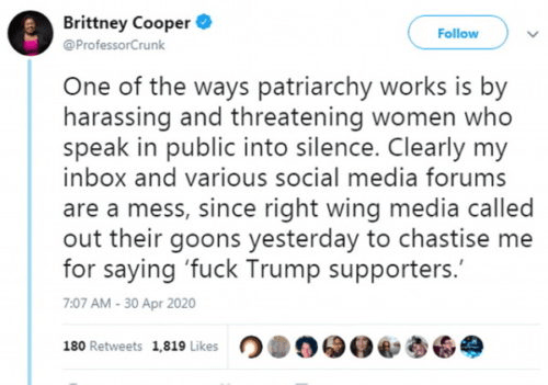• It is a presentation worth seeing (I read the transcript) and it presents an entirely different picture of Brittney Cooper. The one-sidedness and the willingness to stereotype others are there, but the venomous hatred is not. So, a better question, perhaps, is why those horrible tweets, why spew such hatred when the response will be just hatred directed back at her? I wonder if something prompted them, or if the ‘black rage’ just reached a boiling point. Regardless, any objective view of her has to be diminished by the vulgar hatred and prejudice in those tweets.