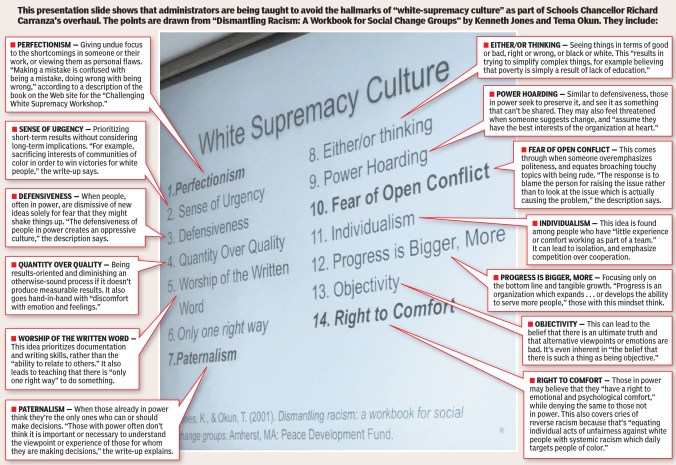 - Don’t allow the museum and the anti-white race mob its administrators represent to sweep this under the metaphorical rug with the assistance of the mainstream media. The chart wasn’t an anomaly, it was, or should be, a wake-up call. For example, New York City—admittedly a mess, with a crypto-Communist mayor—is training its teachers to root out “white supremacy culture.” Here’s a slide from one of the training presentations: