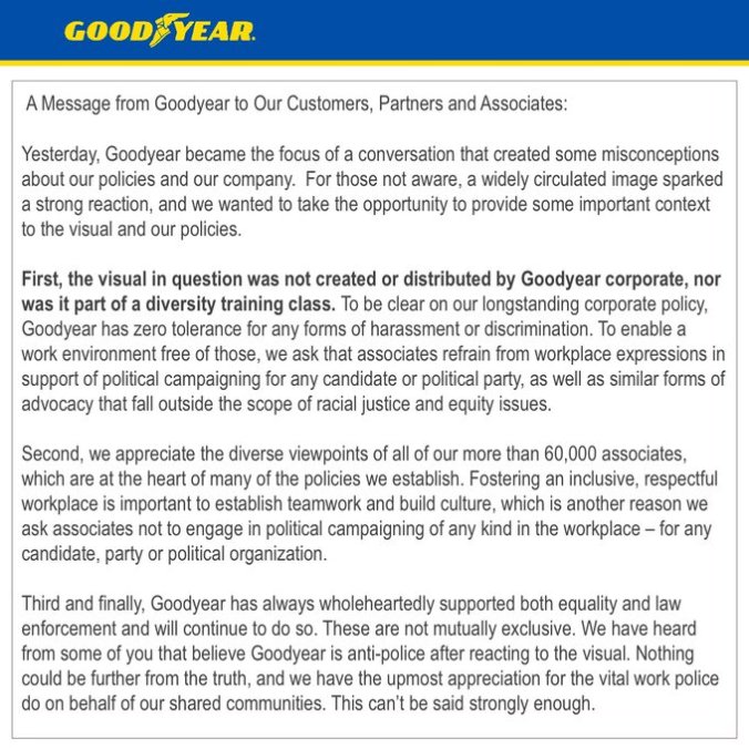“Goodyear is committed to fostering an inclusive and respectful workplace where all of our associates can do their best in a spirit of teamwork. As part of this commitment, we do allow our associates to express their support on racial injustice and other equity issues but ask that they refrain from workplace expressions, verbal or otherwise, in support of political campaigning for any candidate or political party as well as other similar forms of advocacy that fall outside the scope of equity issues.”