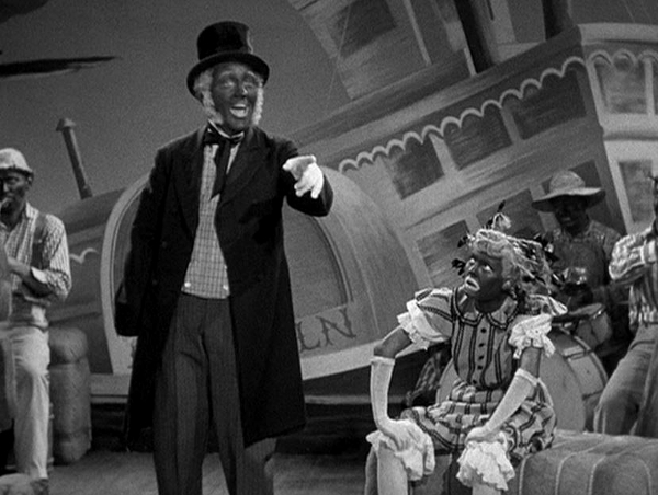 The general is touched when he sees all his men gathered, and they again sing the catchy song they serenaded him with while the Germans were bombing them all those years ago.  The show begins, and “White Christmas” just barely misses falling into the same trap as its predecessor. In “Minstrel Number,” Rosemary, Vera, Danny and Bing do a “Mister Bones” routine; “Mister Bones” (or “Brother Bones” )is also part of the blackface tradition, but the gang is all white.