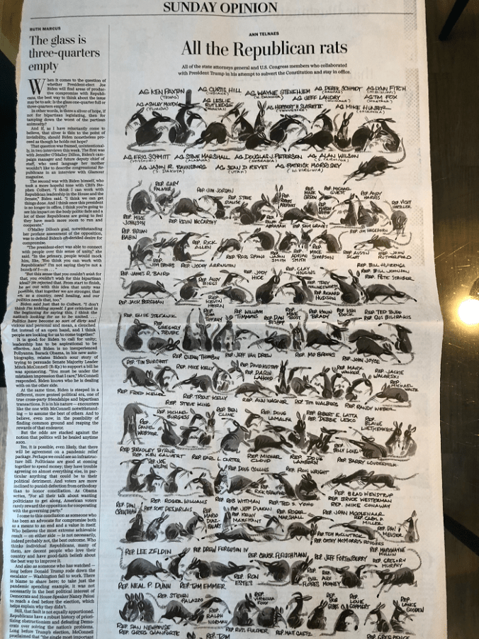 5. Remember how the President was condemned for calling human beings animals when he used the term to describe MS-13 gang members? Twitter, meanwhile, bans tweets that use animal imagery to denigrate…well, any group Democrats like. Never mind: illegal immigrant criminals are human beings, but to the Washington Post, those who challenged the dubious election results are animals, specifically rats. Here is what today’s Sunday Post presented its readers with: