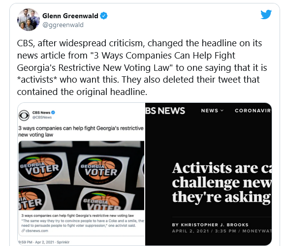 CBS published an alleged “news article” titled “3 Ways Companies Can Help Fight Georgia’s Restrictive New Voting Law.” That’s pure political advocacy, not news reporting. Wrote the Washington Enquirer’s Byron York, “Incredible that CBS News would publish pure political advocacy. This article advocates donor boycotts of specific political figures, spreads political propaganda, and urges passage of a specific bill (HR1). From a news division. Incredible.”