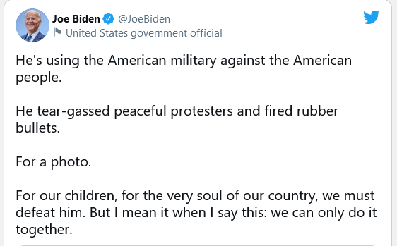 His eventual running-mate, Senator Kamala Harris, said, “Last night I watched as President Trump, having gassed peaceful protesters just so he could do this photo op, then he went on to teargas priests who were helping protesters in Lafayette Park.”  Nancy Pelosi told the propagandists at MSNBC,  “What is this, a banana republic?” when asked to respond to the photo op narrative.