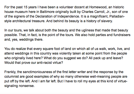 Bingo. The Ethicist is parroting the same ultra-woke hysteria that has led to statue toppling, school-renaming, trigger warning on founding documents and worse. I have often wondered how long it will be before the majority black residents of Washington, D.C. start petitioning to change the name of the city, because living—and getting married!—in a place named after a slave-holder, thus “idealizing lifestyles built directly on the unpaid labor of Black people who were treated as property and regularly abused” is just too much to bear.