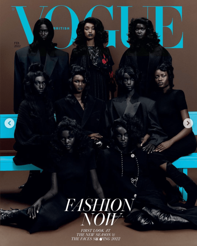 Vogue says: “The nine models gracing the cover are representative of an ongoing seismic shift that became more pronounced on the SS22 runways; awash with dark-skinned models whose African heritage stretched from Senegal to Rwanda to South Sudan to Nigeria to Ethiopia. For an industry long criticized for its lack of diversity, as well as for perpetuating beauty standards seen through a Eurocentric lens, this change is momentous.” But critics say the photo makes blackness seem creepy and threatening.