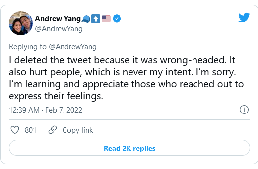 3. Another reason to be glad Andrew Yang didn’t get very far when he ran for President. In the still expanding Joe Rogan and Spotify Ethics Train Wreck, Andrew Yang bought a ticket by opining via Twitter, “I don’t think Joe Rogan is a racist — the man interacts with and works with black people literally all of the time…Do I know black friends of Joe’s who would swear by him? Yes I do.”