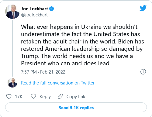 He posts this as Putin is sending his army into Ukraine. What is the right term for such a tweet? Denial? Gaslighting? Senility? I suppose it’s just more reflex Trump bashing under stress.