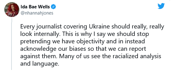 That’s right, Nikole Hannah-Jones sees racism in the reporting on the Ukraine crisis. She also