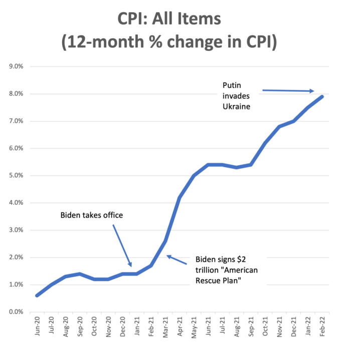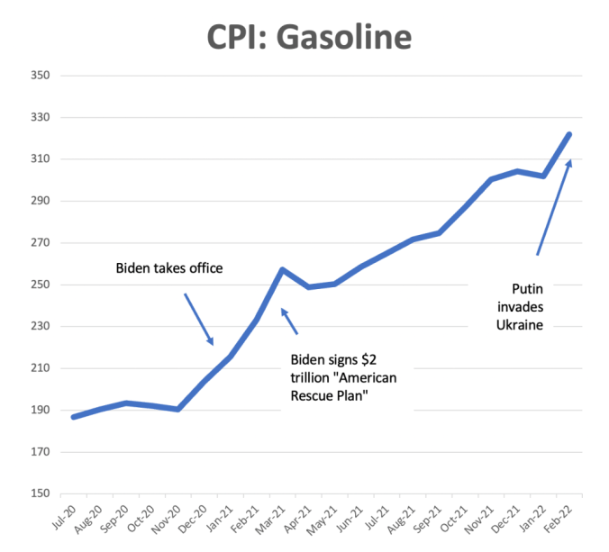 The mainstream media has, predictably and disgracefully, published stories and “factchecks” about why Putin is at fault for inflation. The New York Times, for example, ran a piece headlined: “Republicans Wrongly Blame Biden for Rising Gas Prices.” But the current inflationary spiral began with the Democratic $2 trillion “rescue plan” pushed through Congress through at the start of 2021. Even liberal economists warned that the huge influx of money was irresponsible; former Obama administration economist Larry Summers said that the $2 trillion splurge could “set off inflationary pressures of a kind we have not seen in a generation.” He was right.