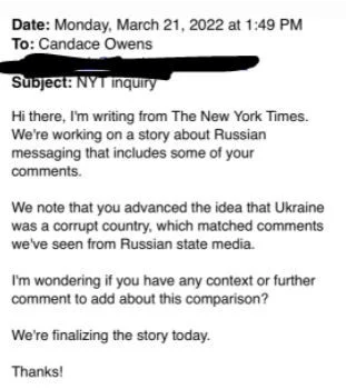 • A Friend raises some good points, but let’s assume for the moment that the country is still just as corrupt as it was before Zelensky’s inauguration. That doesn’t justify Candace Owens’ extreme pro-Russia stance, and that’s what this reporter should have focused on. Here are just some of her recent comments: