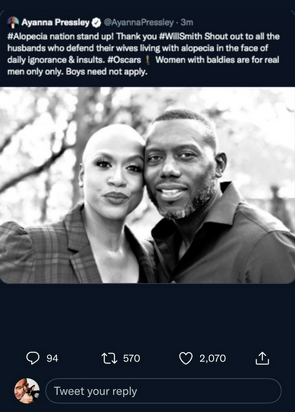 “Many takes on here about Will Smith and Chris Rock, especially from people whose partners are not Black women (mainly white people). I don’t care if it’s a joke or not, the amount Black women have to endure — people are tired of it. We have no idea what Jada has gone through.”