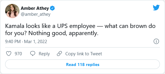 Athey posted a snarky tweet during the State of the Union address mocking Vice President Kamala Harris’s fashion choice. She wore a chocolate brown business suit which Twitter dolts felt was worthy of ridicule. I think it’s fine and irrelevant to anything, but in today’s absurd political environment, not supporting a politician means that can do nothing right. With so much else wrong with Harris (not to mention the State of the Union message the color of her outfit had to be target?