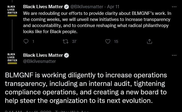 What was your first clue, Sherlock? I knew BLM was a scam from the moment it started misrepresenting Trayvon Martin and Mike Brown on its website. Now I want to hear from Kamala Harris, Maxine Waters, D.C.’s mayor Muriel Bowser, all the toadying corporations, the NBA, the NFL, the Boston Red Sox and so, so many others who have enabled these racist, destructive frauds.