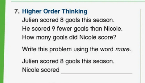 I do not really have a problem with the word problem. It is in the nature of a word problem to apply mathematical thinking to a real-life example. Not only did it ask you to perform a simple mathematical operation, it also made you think about concepts about more and “fewer” (the fact they got that word right is to their credit), and the relationship between those numbers.