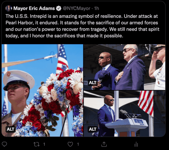 2. On the other hand, I’ll “pounce” on this one. NYC mayor Eric Adams attended a Memorial Day Ceremony at the USS Intrepid Museum, which a re-purposed WWII carrier. Then he tweeted,