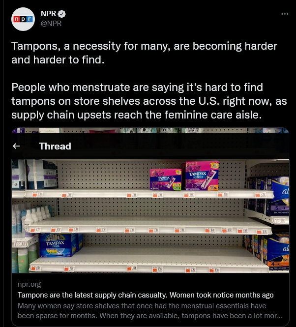 Like so: Supply chain upsets reach the feminine care aisle: customers complain tampons are becoming harder and harder to find on store shelves across the U.S. right now.