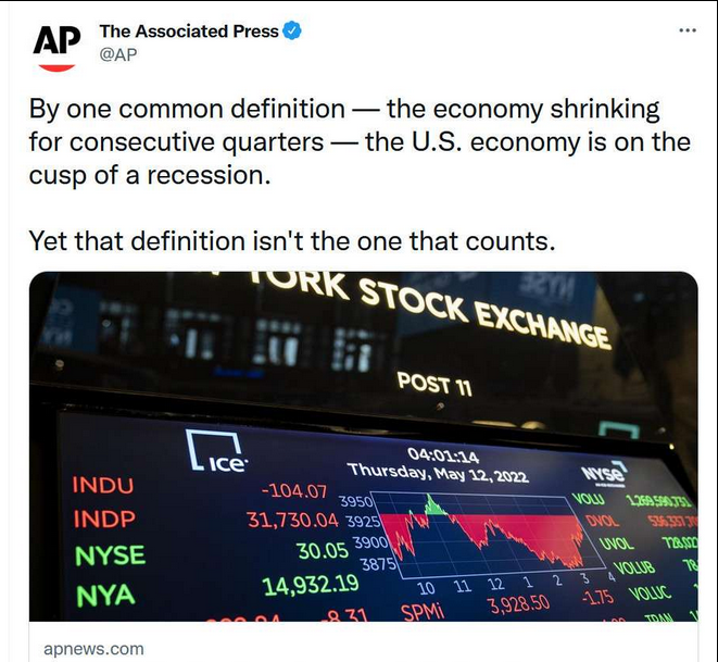 4. And if that wasn’t enough... As I predicted (and as anyone could) the media is rushing to bolster the Biden administration brazen attempt to avoid the recession it is responsible for by pretending there isn’t one. Here’s the AP now…