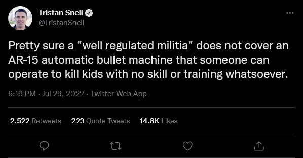 He really did. This is why I caution lawyers not to use Twitter, since for some weird reason it lowers lawyer IQs by double digits. As a lawyer, one would think that he understands that his obtuse reading of the Second Amendment has been expressly rejected by the U.S. Supreme Court. Before publishing such an ignorant statement, moreover, one would think that a lawyer might take some steps to educate himself, so he wouldn’t call an AR-15 an “automatic” weapon.